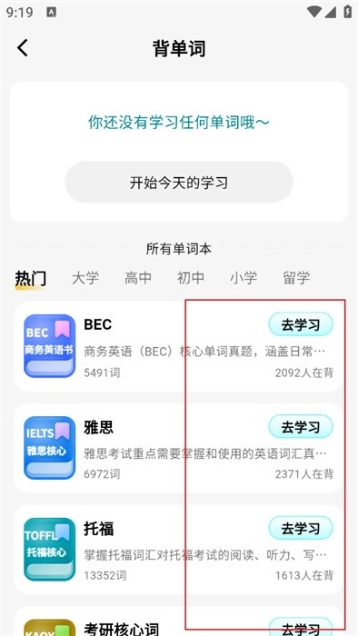 4、随机点一本单词本,就能进入并开启自己的学习,还能在线设置学习内容;