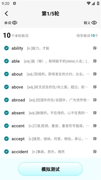 5、在这里能看到很多词汇,都能在线收听发音,还能进行对当前学习的内容进行测试,十分的全面。