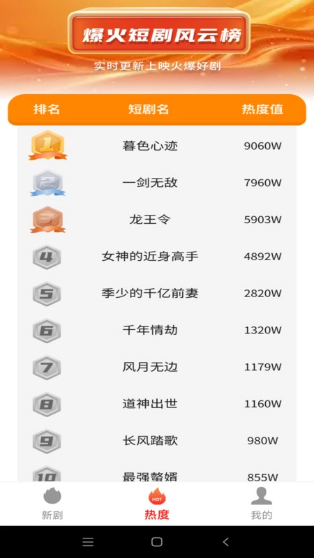 2、在热度页面中可以了解各类最新的排名,及时的掌握各类短剧排行榜的信息内容。