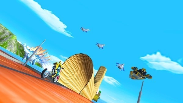1、玩家将驾驶特技自行车挑战各种复杂赛道,完成空中翻滚、极速跳跃等高难度动作;