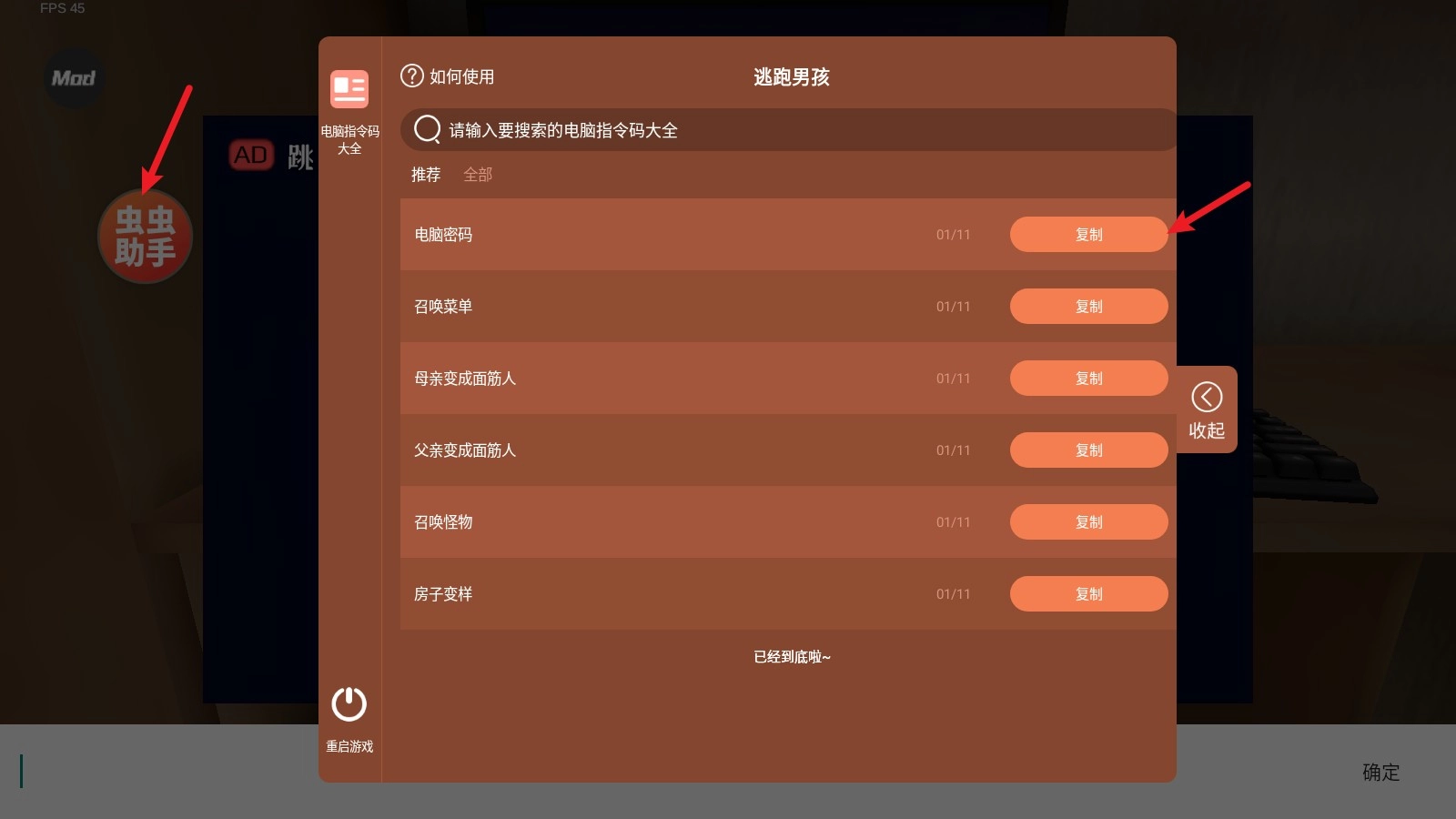 3、要是觉得输入过程太过繁琐,亦或是不想进行切换复制操作,那么可直接点击左侧的虫虫助手,在此处,每个代码都能直接复制。