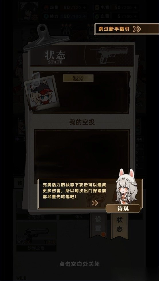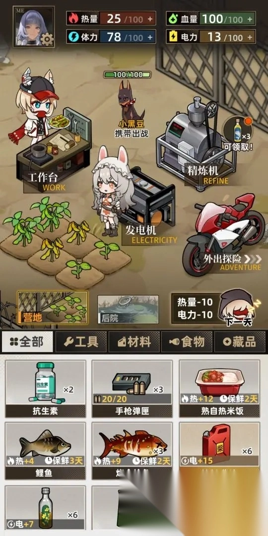 2. 页面上方会展示角色的属性能力,像热量、体力、电量以及血量,以提醒玩家适时进行补充。