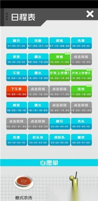 心情值也是少于10%影响健康值可以通过日程表里心愿单上下午14点半的下午茶恢复(低于10%每次做事消耗3点健康值)