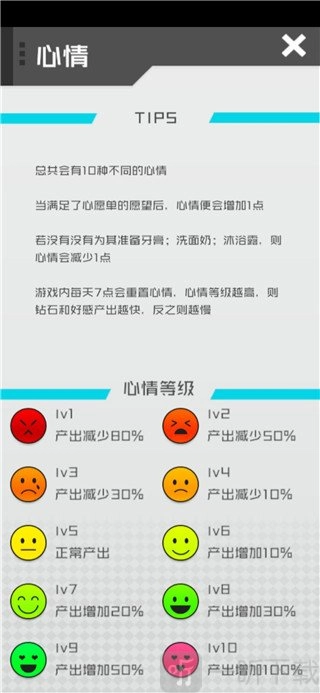 在任务下方的脸,点击即可进入查看,共有10个脸,分别对应1 - 10级。5级属于正常状态,5级以下代表心情不好,5级以上则心情一级比一级好。心情的好坏与心愿单以及个护相关,满足Luna的吃喝心愿和个护需求,每次差不多能增加1级,差不多到中午就能达到10级。当然,这也和自身收入的钻石数量有关,钻石少,满足Luna的需求就少,等级也就会低一些。