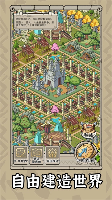 1. 玩家进入游戏后,能够通过点击起源下方的随机事件,来提升种族的战力、人口等。