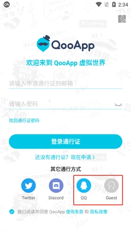 2、若点击游客登录,页面将跳转至此。此时,可点击左上角按钮返回主页面;也可申请qooapp虚拟世界通行证,只需填写下方相应信息即可。