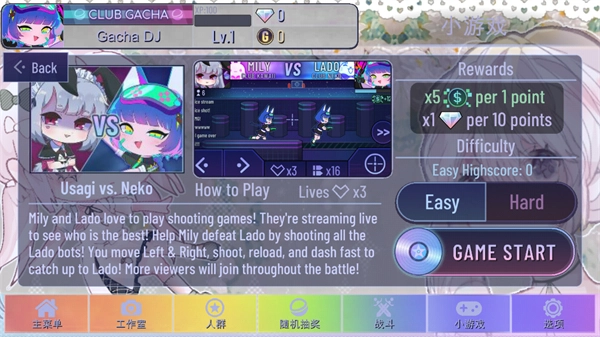 在这款小游戏里,玩家要操控界面上象征Mily的准星,通过左右移动或者冲刺的方式,对出现的代表Lado的敌人进行射击。