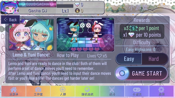 在这个小游戏里,Lemo和Yuni两人会通过一组舞步,来指示接下来要求玩家输入的箭头(包括两侧、上下左右方向)。