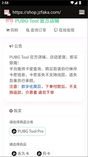 2、跳转到外部页面,来到pubgtoolpro官方店铺,选择买永久卡或者月卡