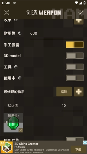 4、修改皮肤的武器和工具(剑,斧,)。