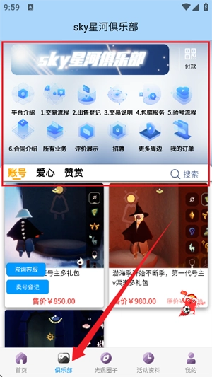 4、于【俱乐部】内,玩家能够开展账号交易,还能够买到更多游戏周边。详情如图所示。