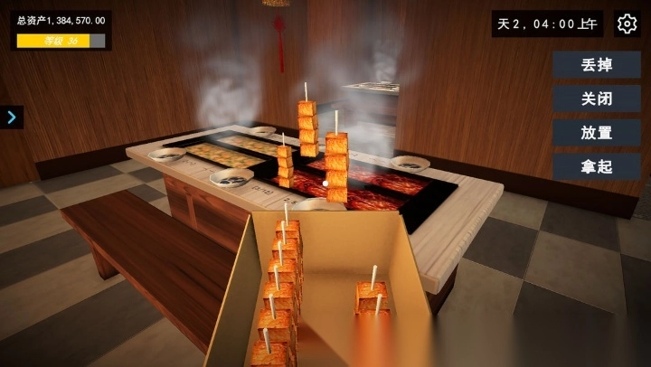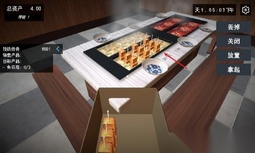 4)收货与摆放:物资送达后,点击拿取并打开包装,随后靠近餐桌将关东煮摆放妥当。
