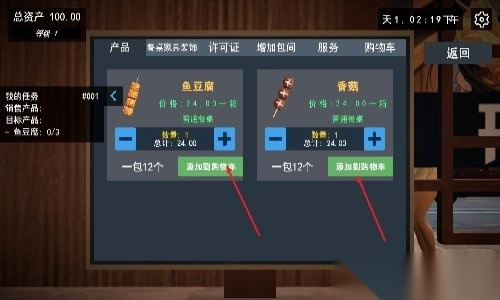 3)采购食材与物资:点击店内电脑进行进货,选择所需食材与设备,为店铺运营做好准备。