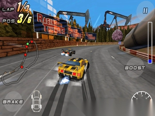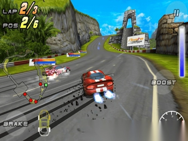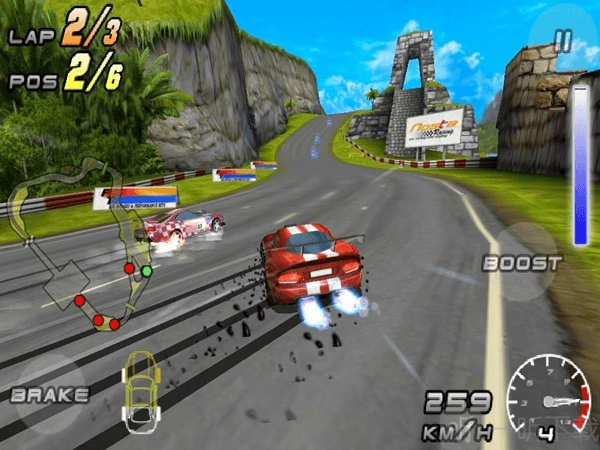 位于左下角的“brake”按键是刹车键,按下它能够使速度降低。右边中间位置的“boost”则是加速键,点击此加速键会消耗氮气,进而提升速度,氮气可在游戏过程中进行收集。