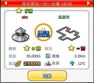 3、挑选到合适的对手后,点击进入对战详情页面。在此页面,能查看赛事环境,其中涵盖场地条件、获胜后可获取的星级,以及预测胜率。依据场地条件对赛车手与赛车的配置进行调整,能有效提升胜率。点击游戏左上角的星级图标,便能查看自身的对战记录与排名状况。