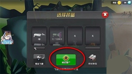 2、点击【发现僵尸】后,进入到湿地沼泽,点击移动飞碟停下的地方。界面弹出选择装备框,选择捕捉僵尸的勾子,点击【捕捉僵尸】。