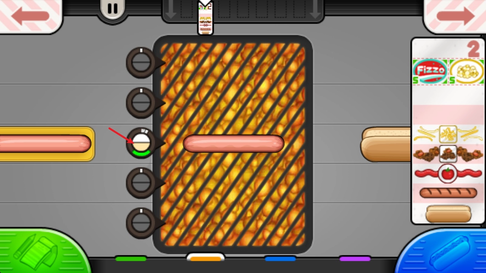 1、第一步是煎烤肠,在此过程中,要留意旁边的温度计,温度计分为上下两侧。当其中一侧颜色变成橙色时,就意味着该给烤肠翻面了,等两面都变成橙色,便是烤肠出锅的最佳时机。