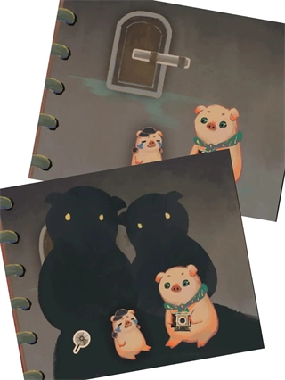 4、首先拉开门栓,接着点击木门,然后点开帽子小猪旁边的箱子,从中拿到一个不明物体(暂时称它为圆盘),把这个圆盘拖到相机处,最后拍下合照。