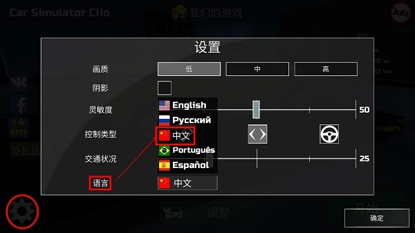 2、进入游戏,点击左下角的“齿轮”位置处,进入游戏设置,在语言选项里选择中文即可。