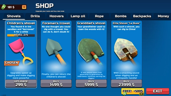 3、钞票能够用于升级铲子,还能解锁更优质的铲子与钻头。