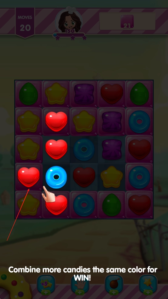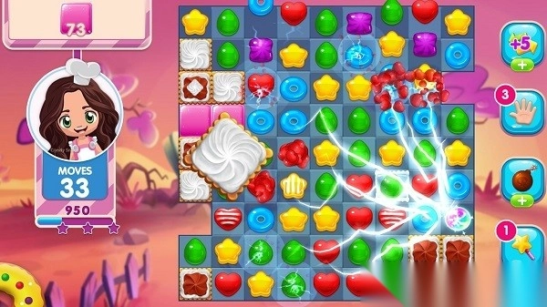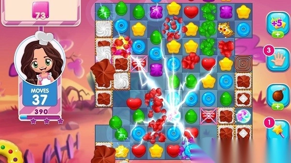 2、当消除四个及以上糖果时,会生成特殊道具,像炸弹、彩虹糖之类。点击道具或者交换道具位置,就能触发大范围消除,帮助你迅速达成关卡目标。