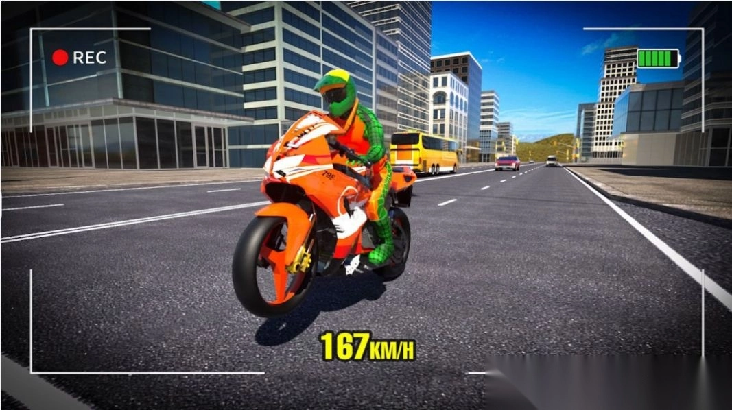 2、公路模式避车辆,保持高速(如167KM/H);特技模式冲环形赛道,完成翻转。