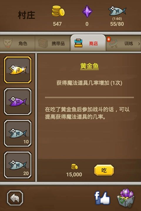 4、花费15000金币购买一次性的黄金鱼,借此提高下一次获取高级装备的几率。
