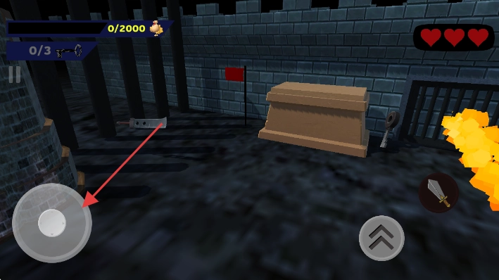 2、滑动左侧虚拟摇杆,操控角色在石墙牢笼区域行走、转向,勘查环境。