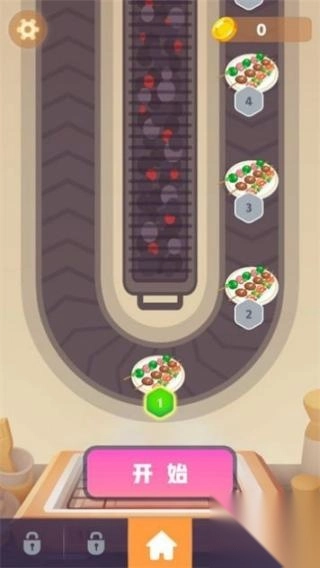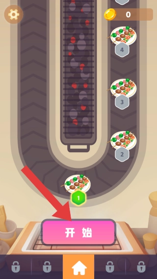 2、界面中设有【开始】按钮,还有展示数字1 - 4的食材串餐盘,以及金币、设置齿轮图标,底部功能栏包含主页等图标。这些元素共同体现烧烤制作、关卡推进等玩法。