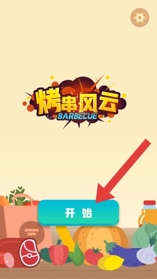 1、右上角有设置齿轮图标,底部展示食材(肉、蔬菜等),体现烧烤经营主题,点击【开始】方可进入。