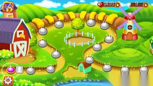 2、画面中有标有数字(1-15)的圆形关卡图标,显示游戏的关卡推进系统,玩家通过推进关卡体验农场相关玩法。