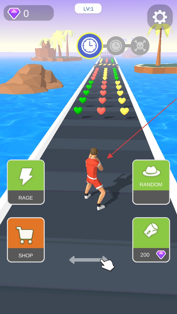 1、收集爱心强化能力:操控角色在跑酷途中收集不同颜色爱心,爱心可提升攻击力、速度等属性,通过持续收集强化自身,为关底功夫评测奠定实力基础。