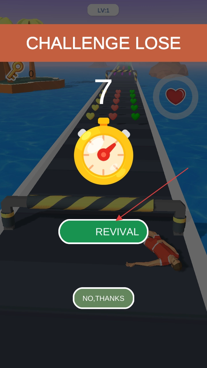 3、挑战失败(如没按时到),可点“REVIVAL”复活重试,或选“NO,THANKS”重新开局,积累闯关经验。