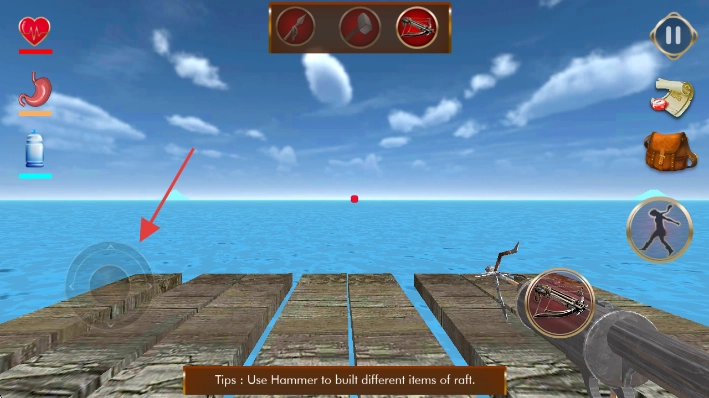 2、滑动左侧圆形摇杆,操控角色在木筏上行走、转向,探索水域环境。