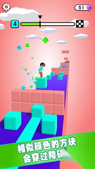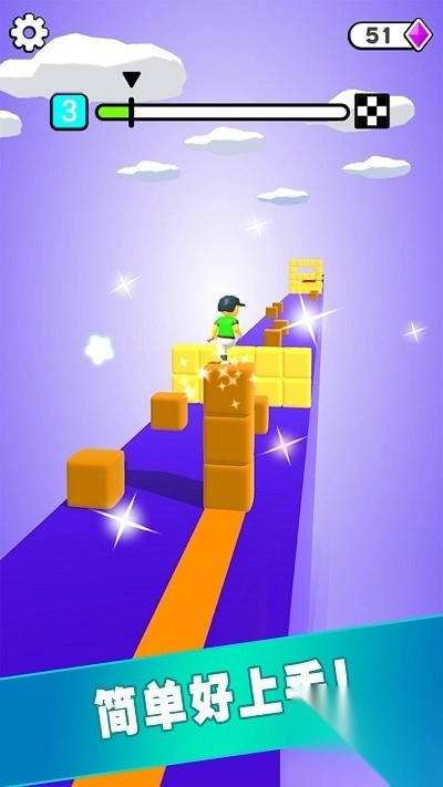 3、抵达终点前保持方块储备应对突发障碍,通关时间越短得分越高,解锁更多风格独特的赛道与角色皮肤。