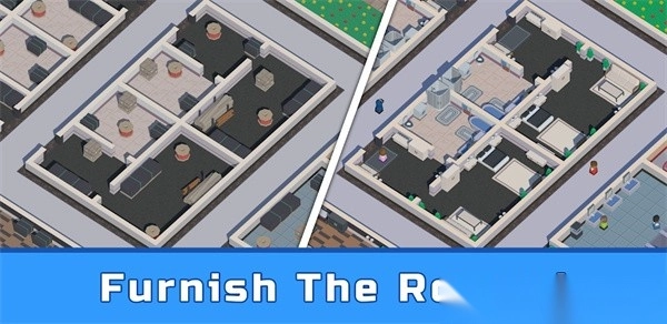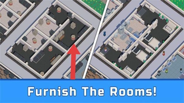 3、展示房间布置前后的对比场景,属于酒店、公寓等模拟经营,通过装饰房间提升设施品质、吸引顾客的玩法内容。