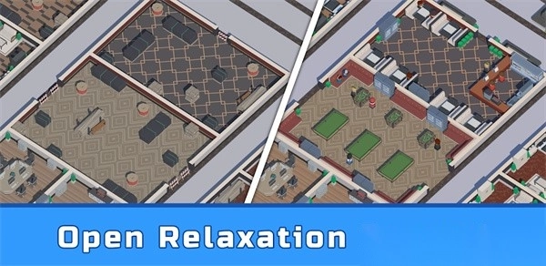 2、重点关注OpenRelaxationRooms的玩法,展示休闲室布局改变前后的场景。这部分内容属于酒店、度假村之类的模拟经营范畴,涵盖打造休闲设施以及升级服务场景等方面。