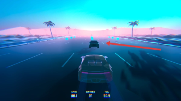 2、发现箭头标记的前方车辆,调整车速,尝试追逐、超越,完成竞速目标,提升游戏分数。