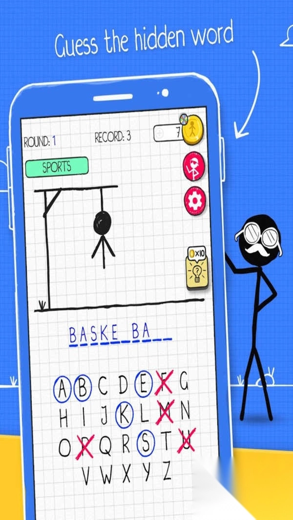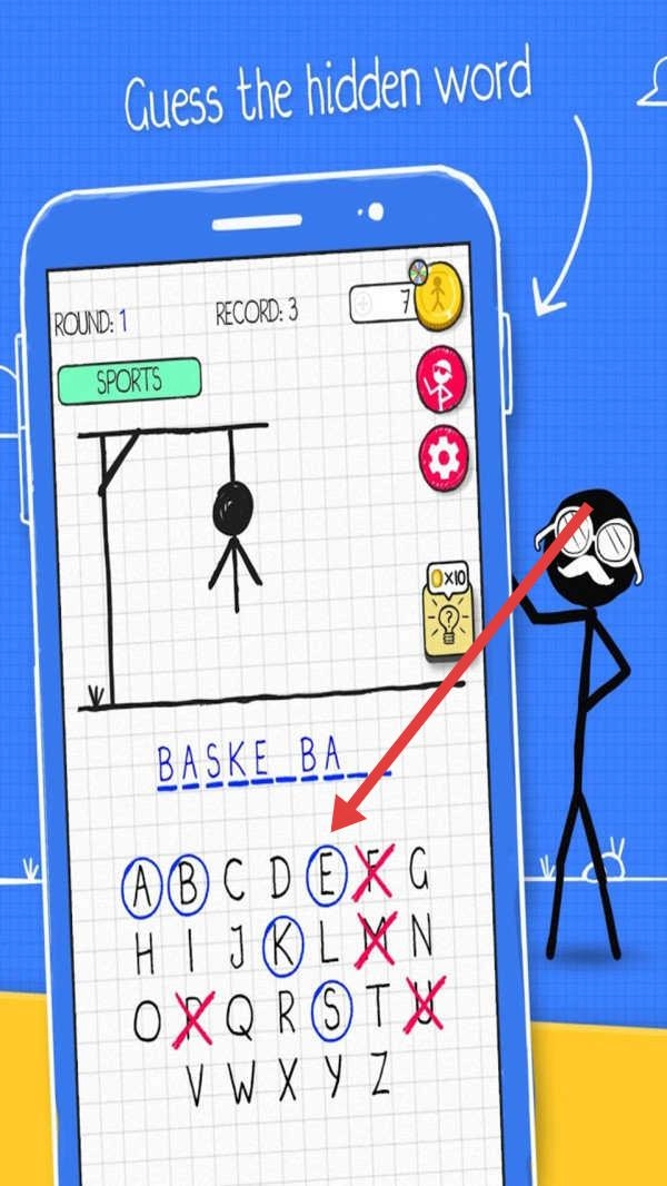 3、进行猜词操作时,点击箭头所指的字母(例如E、K、S ),将其填入“BASKE_BA__”中,注意避开带有叉号的字母,以此完成解谜。