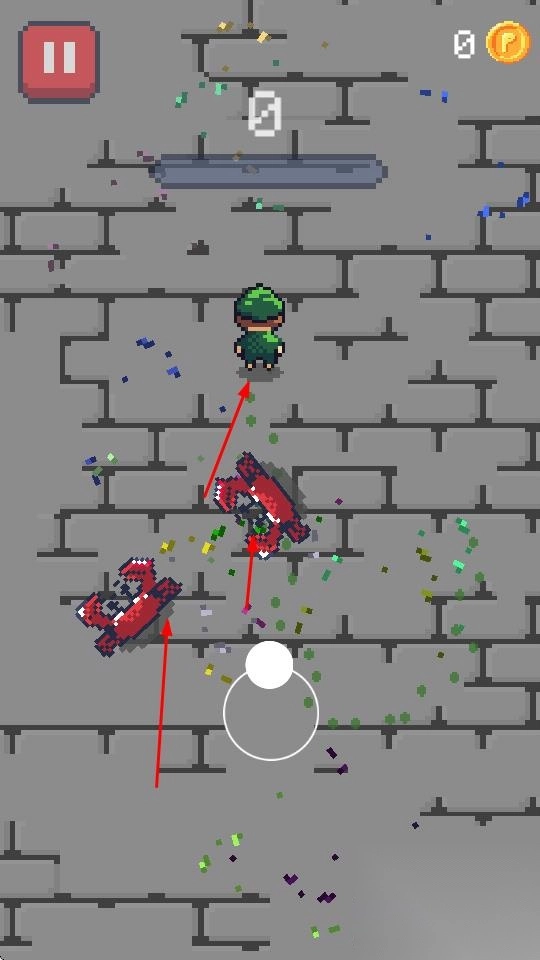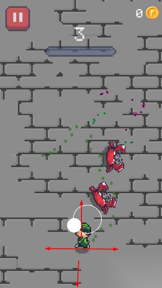 1、操控像素角色在砖石场景移动,通过上下左右滑动,躲避红色怪物攻击,保持生存推进。