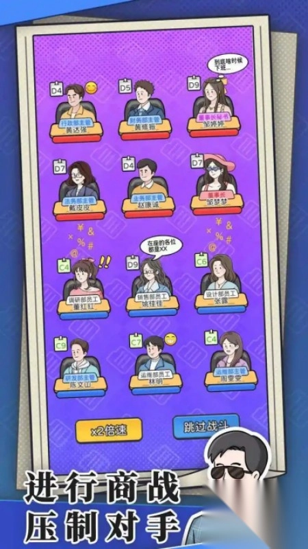 2、商战时观察对手阵容,用克制技能员工,集中火力打关键角色。