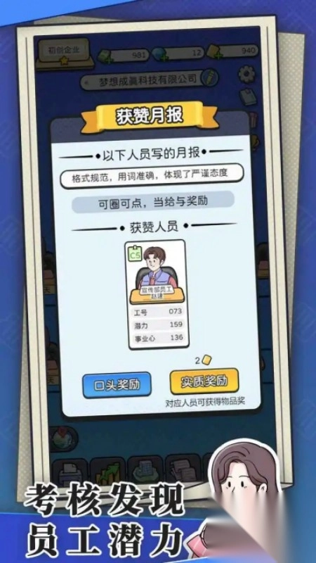 模拟打工人,这是一款玩法简洁的模拟游戏。玩家从一家初创企业开启征程,在此过程中,不仅要招聘员工,还要在商战中压制竞争对手,通过考核挖掘员工潜力,更能够成立全新部门谋求企业发展。玩家将完整体验从职场小白一路成长为商业大佬的全过程,在各种决策与挑战中,书写属于自己的人生故事,尽情感受成长与商战带来的双重乐趣。