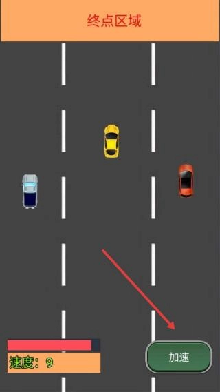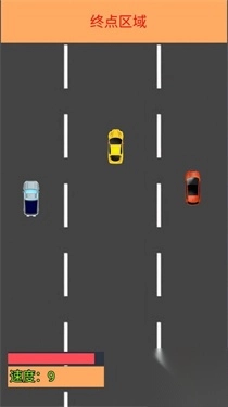 2、避左右车辆(蓝、红车),直线冲刺终点区域,保持速度(如9)领先。