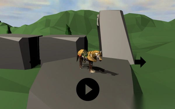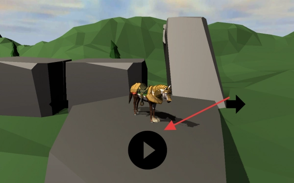1、点击黑色播放按钮,启动游戏,操控马匹在场景中行动。