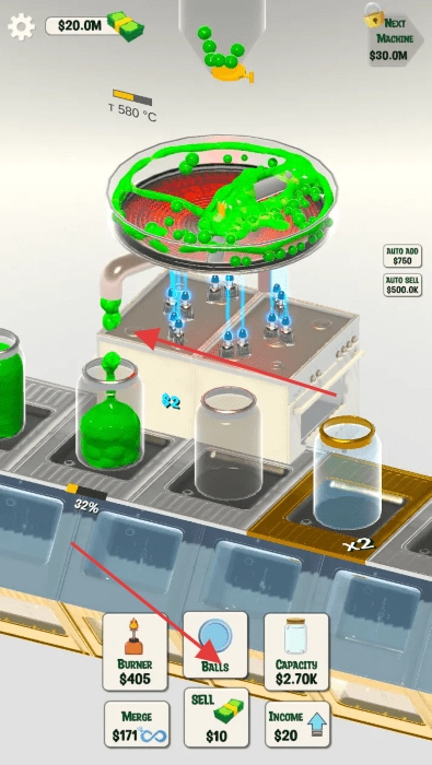 1、点击启动初始熔炼机,将首个塑料球投入高温炉腔,看着球体逐渐融化成液态开启熔炼之旅。