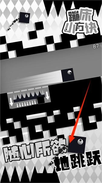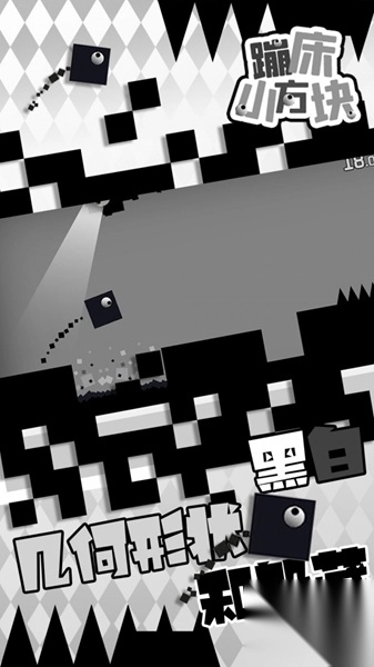 1、操控方块在黑白几何场景蹦跳,躲避尖刺等障碍,扮演英雄立方体前行。