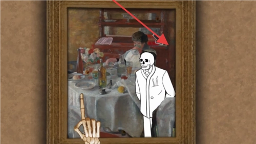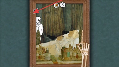 1、找红色箭头指向区域,点击互动,让骷髅(或手)触发,显隐藏元素(如物品、人物)。