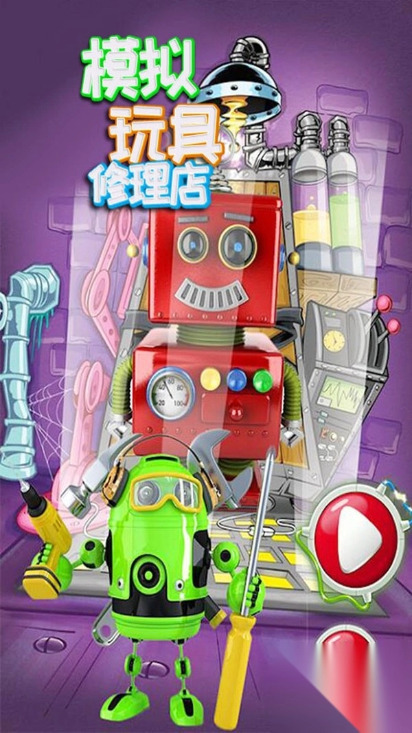 1、红色播放按钮(是开始游戏)、白色星星按钮(或为收藏、奖励功能),玩家扮演修理工修复玩具。