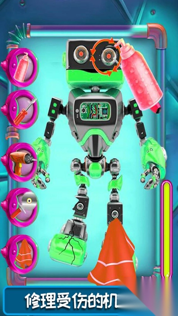 2、在“疯狂的机器人修复”玩法中,玩家扮演修理工,借助工具对受伤的机器人进行修理与翻新,通过操作这些工具来完成整个修复流程。