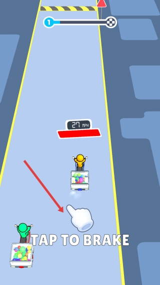 2、在比赛进行过程当中,当出现“TAP TO BRAKE”这一提示的时候,点击屏幕即可触发刹车,进而控制车速,同时要躲避赛道上的障碍,并努力超越对手。